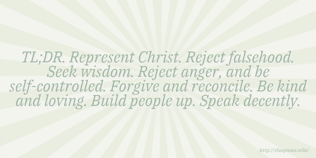 In these passages in Ephesians, Colossians, and James, we can see that Christians should speak and think with truth and wisdom, without “bitterness, wrath, anger and slander”, representing Christ and loving others, being conciliatory and (literally) constructive, and showing self-control and social propriety. We should do so because we have a new life, united with Christ and with others in God. Their old and ‘earthly’ life is now to be characterised by the ‘heavenly’ qualities of God’s nature and wisdom, which will in future characterise his remaking of the whole universe in perfection. And because all human beings are representations of God, they must be treated accordingly by Christians.